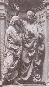 Tomé, um dos doze, chamado o gêmeo, não estava com eles quando veio Jesus.                            Disseram-lhe, pois, os outros discípulos:  “Vimos o Senhor.”  Ele, porém, lhes respondeu: “Se não lhe vir nas mãos as marcas dos cravos, se não meter o dedo no lugar dos cravos, e não lhe introduzir a mão no lado, não acreditarei.”